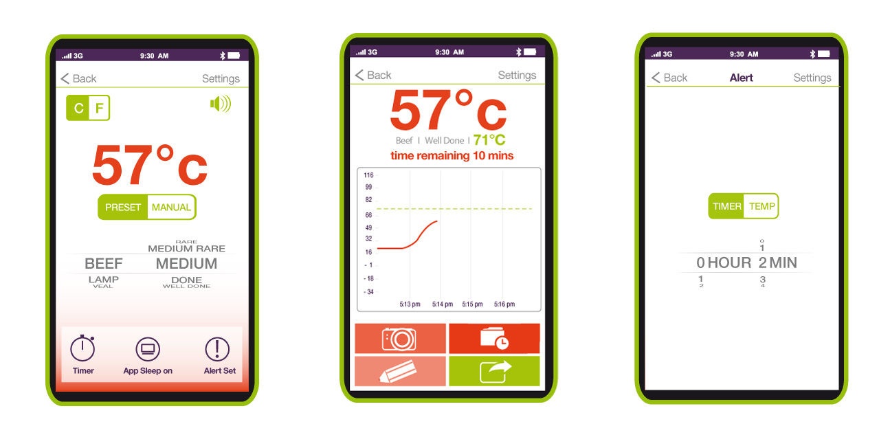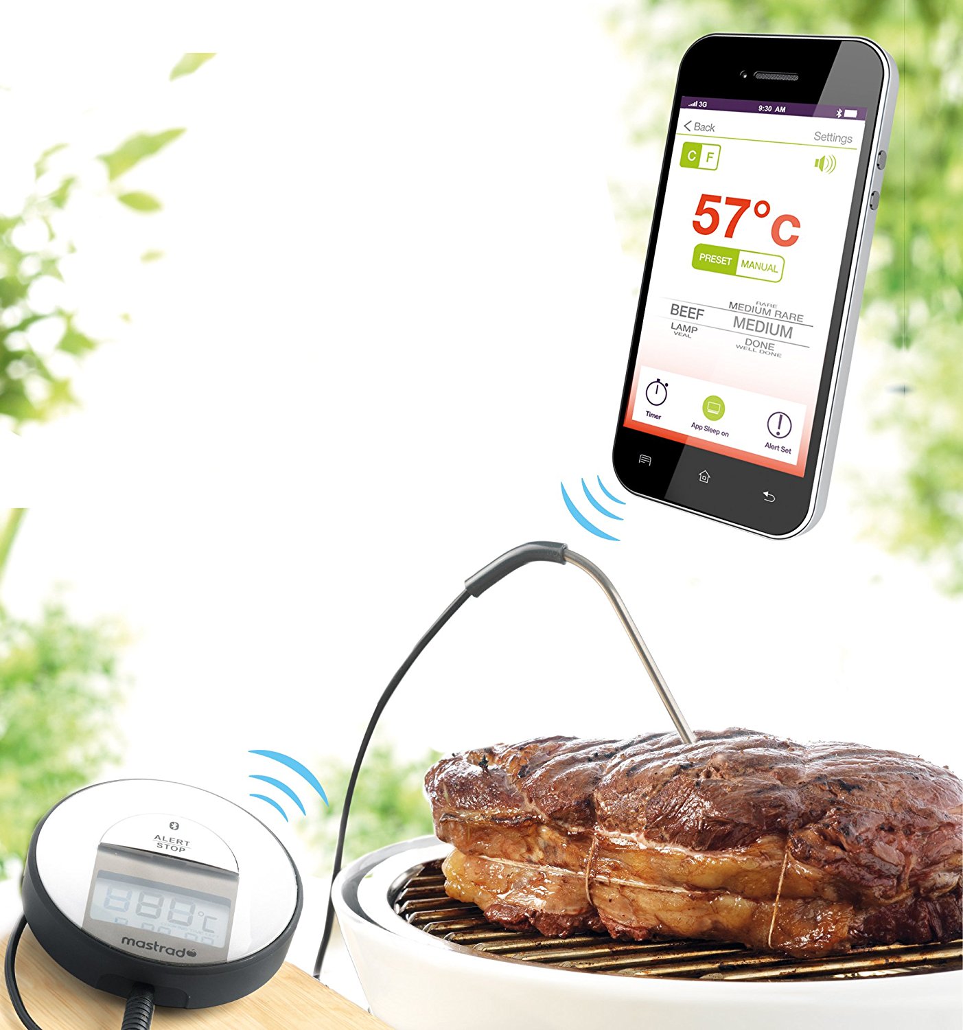 A Bluetooth-hőmérő valós időben tájékoztatja Önt okostelefonján vagy androidos táblagépén a hús aktuális hőmérsékletéről. A csomagban talál egy szondát, amelyet a húsba helyezünk, 1 m-es kábellel és bluetooth 4.0 jeladóval felszerelve... Mérhető hőmérséklet -50 ° C-tól 300 ° C-ig THERMSmart okostelefon használatával riasztási funkcióval és hőmérséklet kiválasztással a különböző hústípusokhoz. A készülék hátoldalán található ON/OFF gomb nélkülözhetetlen segítője lesz a grillezett húsok elkészítésében. Lepje meg vendégeit grillezés közben. Egy alkalmazással, amellyel nyomon követheti és szabályozhatja a hőmérsékletet, kínálja fel nekik a kívánt hús sütését. A sültek vagy steakek esetében biztos, hogy sikerrel jár. Az 1 méteres kábellel nem kell megérintenie a szondát, ha már a húsba helyezte. A lángon kívül található adóegység minden információt továbbít az okostelefonjára. Így anélkül élvezheti a vendégeit, hogy a grillsütőnél kellene maradnia. A riasztási funkció problémák esetén (pl. túl magas hőmérséklet) működésbe lép. Méretek: 12 x 2 x 7,5 cm.