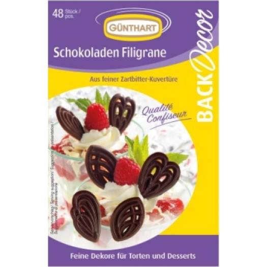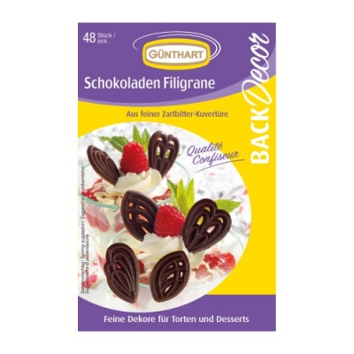 A csomag 48 csokoládéfiligránst tartalmaz. A csokoládé filigránok sütemények, cupcake-ek, tekercsek és más népszerű desszertek díszítésére használhatók különböző alkalmakra. Kakaó 57% min. Cukor, kakaómassza, kakaóvaj. Nyomokban tejet, szóját és dióféléket tartalmazhat.