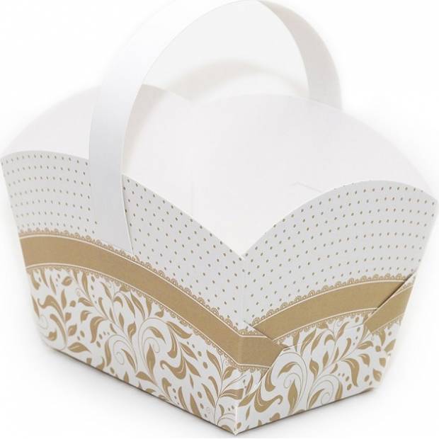 A fogantyús esküvői kosár alkalmas esküvői ajándékoknak, édességeknek és süteményeknek. Fehér gyöngyházpapírból készült. A kosár kibontva érkezik, de nagyon könnyen összeállítható. Méret: 10 x 6,7 x 8 cm.