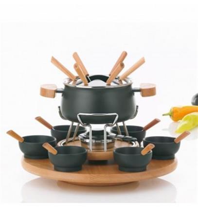 Luxus, elegáns fondue készlet zománc, rozsdamentes acél és fa kombinációjával, forgó tálaló alátéttel.