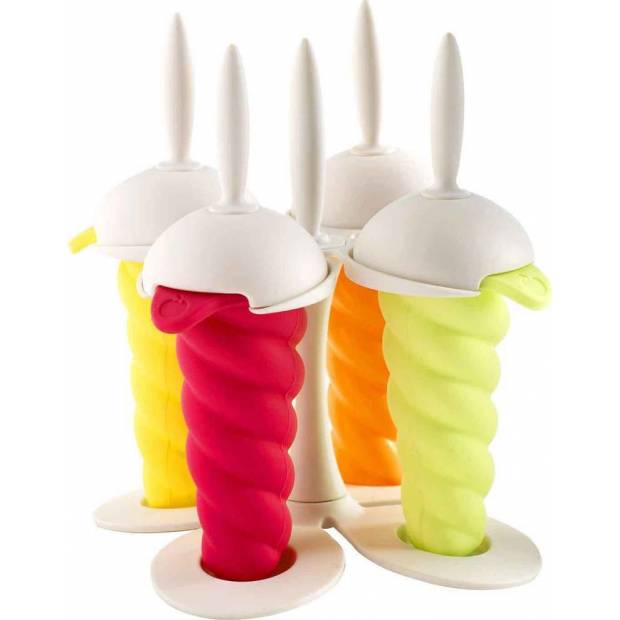 Praktikus, 4 darabos fagylaltformából álló készlet, amely stabil állványon helyezkedik el. A termék méretei 15x16cm. Minden forma teljesen más színnel büszkélkedhet. A gyártás anyaga szilikon és polipropilén, azaz nem mérgező elemek. A házi készítésű fagylalt előállítása szilárdan a kezedben lesz.