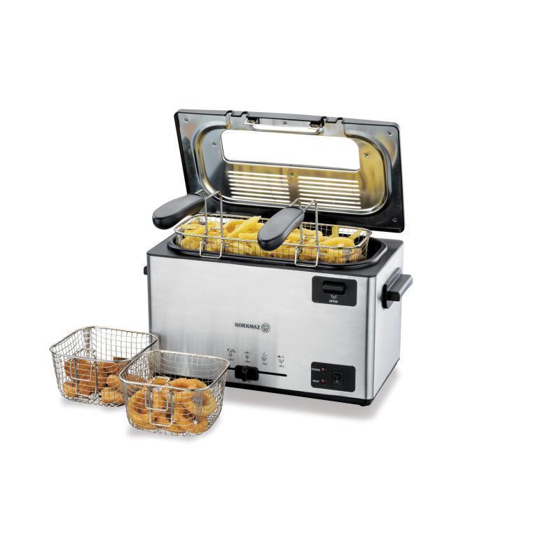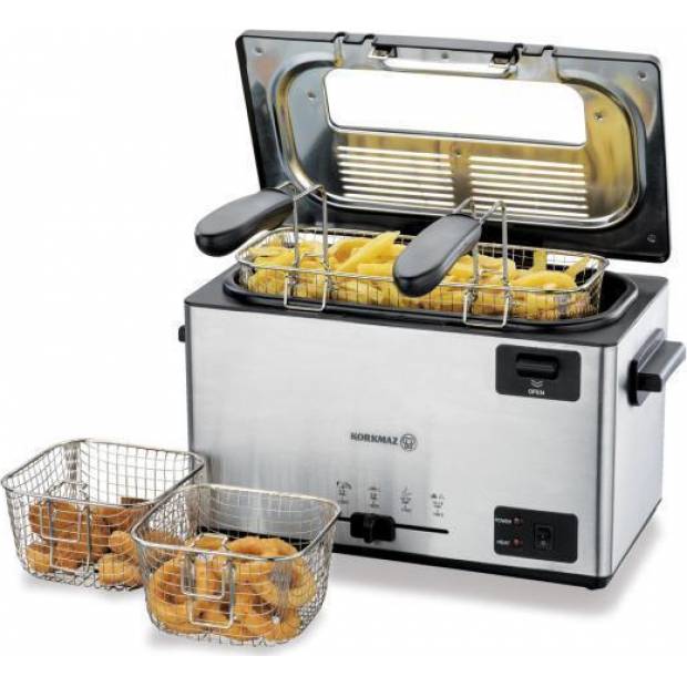 Professzionális rozsdamentes acél mélysütő 3000 ml űrtartalommal és 2000 W teljesítménnyel. Három acélkosarat tartalmaz.