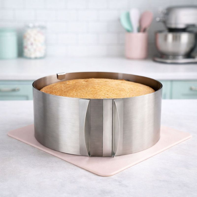 Állítható tortaforma 16–30 cm-ig: könnyedén készíthet különböző átmérőjű tortákat tökéletesen egyenes peremmel – ideális otthoni és profi cukrászoknak.