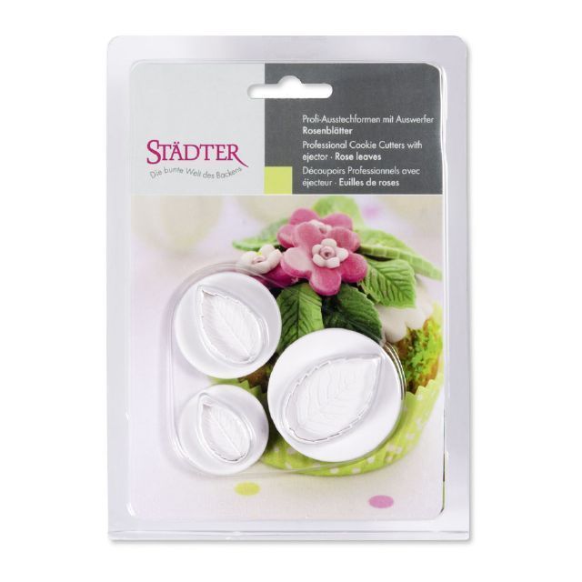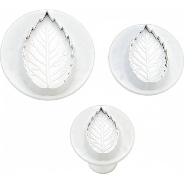 Rózsaszirmok formájú, 3 darabos műanyag dugattyúvágó készlet. A sütemények vagy desszertek díszítése egyszerű. A vágót a kinyújtott masszára helyezi, a dugattyú megnyomása nélkül - csak a vágó körkörös megnyomásával - vágja ki a leveleket. A kivágott forma belül marad, és a dugattyú segítségével kinyomja. A tortát közvetlenül a kivágással díszítheti - a kivágást a torta felületére helyezi, és csak megnyomja a dugattyút.