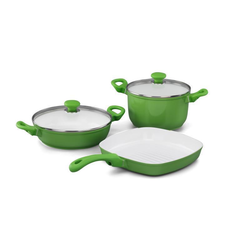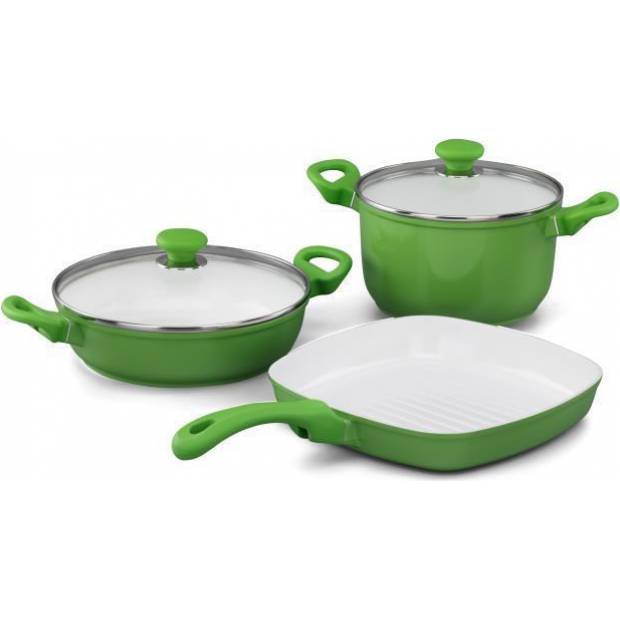 A készletben talál egy hagyományos formájú, 24 x 6 méretű (2,6 l) fazekat, egy 20 x 11 cm méretű (3,5 l) alacsony változatot és egy 24 cm átmérőjű, kb. 2 l űrtartalmú serpenyőt. Minden olyan anyagból készült, amely gyakorlatilag tapadásmentes, így elegendő a zsír felét vagy még kevesebbet használni, és a tökéletes hővezetésnek köszönhetően a főzés nagyon gyors és alacsony energiafogyasztású, így gazdaságilag előnyös. A tisztítás és mosás nagyon egyszerű, a termék emellett teljesen környezetbarát, nem károsítja a környezetet, megfelel a legszigorúbb szabványoknak és előírásoknak is. Zöld műanyag fogantyúkkal és a fedeleken lévő gombokkal felszerelt.