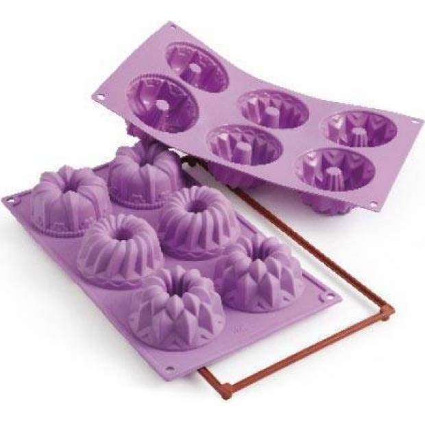 Ebben a szilikonformában hat kisebb batyut süthetsz, amelyek nagyon szép formájúak. Egy bundt cake térfogata 100 ml, így a tészta mennyiségét be kell állítanod. Mielőtt megtöltöm a formát, enyhén megkenem olajjal, a felesleget szalvétával eltávolítom, és szintén csak enyhén porítom be félszemcsés liszttel. Bármilyen tésztát használhatsz, én általában könnyebb piskótatésztát készítek sima lisztből, és a formát is enyhén kizsírozom. Az egész formát körben megerősítem egy kivehető csíkkal, amit a sarkoknál lehet rögzíteni. Ez a formával együtt befér a sütőbe, és így könnyen hordozható. Nekem nem okoz gondot e sín nélkül sütni, a formát egy tepsire helyezem. A forma forrólevegős és gázüzemű sütőkhöz egyaránt alkalmas.