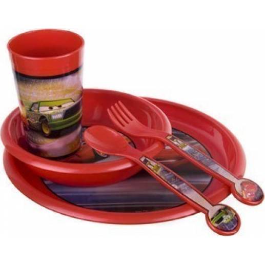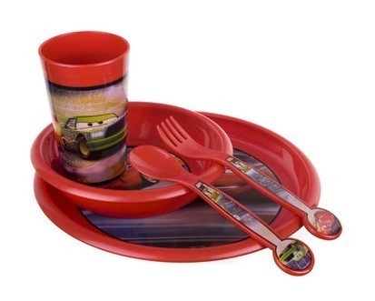 A piros színű, vidám versenyautó-motívummal ellátott komplett készlet a népszerű gyerekfilmből származó, egyszerű étkezési lehetőséget kínál a kicsiknek, amely a tartós műanyag szerkezetnek köszönhetően biztosan nem törik el.