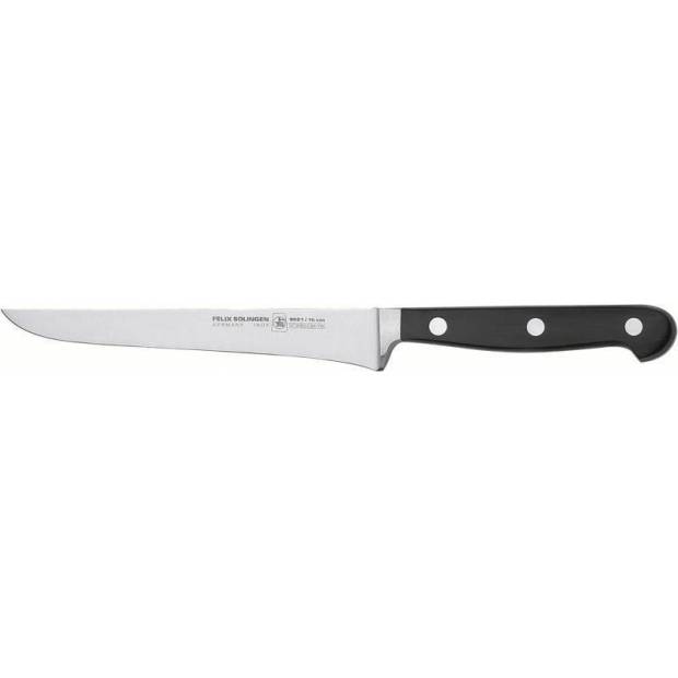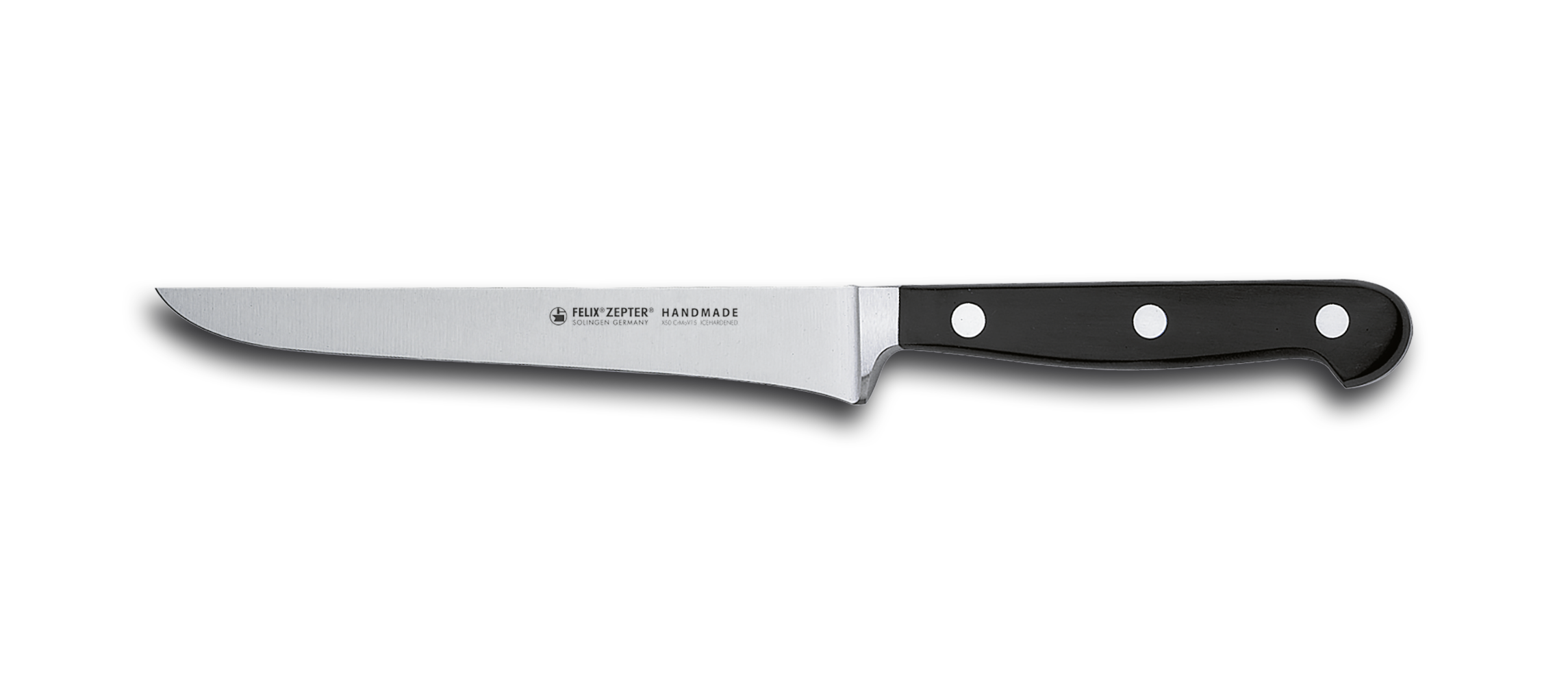 Ezzel a késsel sebészi pontossággal választhatja el a húst a csontról. A penge X50 CrMoV15 jelöléssel van ellátva, ami azt jelenti, hogy molibdén, vanádium és króm keverékéből készült, és ez a fajta acél az egyik legfinomabb, és az orvosi alkalmazásokban is használják. A penge szintén kézzel kovácsolt. Ez a késtípus otthoni főzéshez és professzionális konyhákhoz egyaránt alkalmas. A penge hossza 15 cm. Teljes hossza: 27,5 cm. Súly: 0,1 kg.
